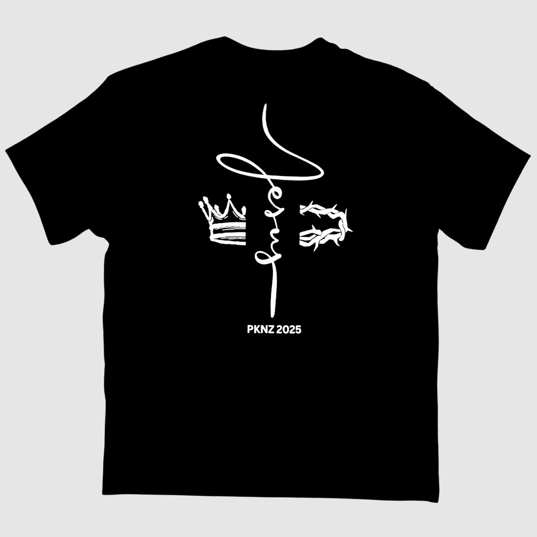 Black T-Shirt with Refiner’s Fire flames and PKNZ 2025 Event on the front. On the back is the cross with the words Jesus and crown of thorns.
