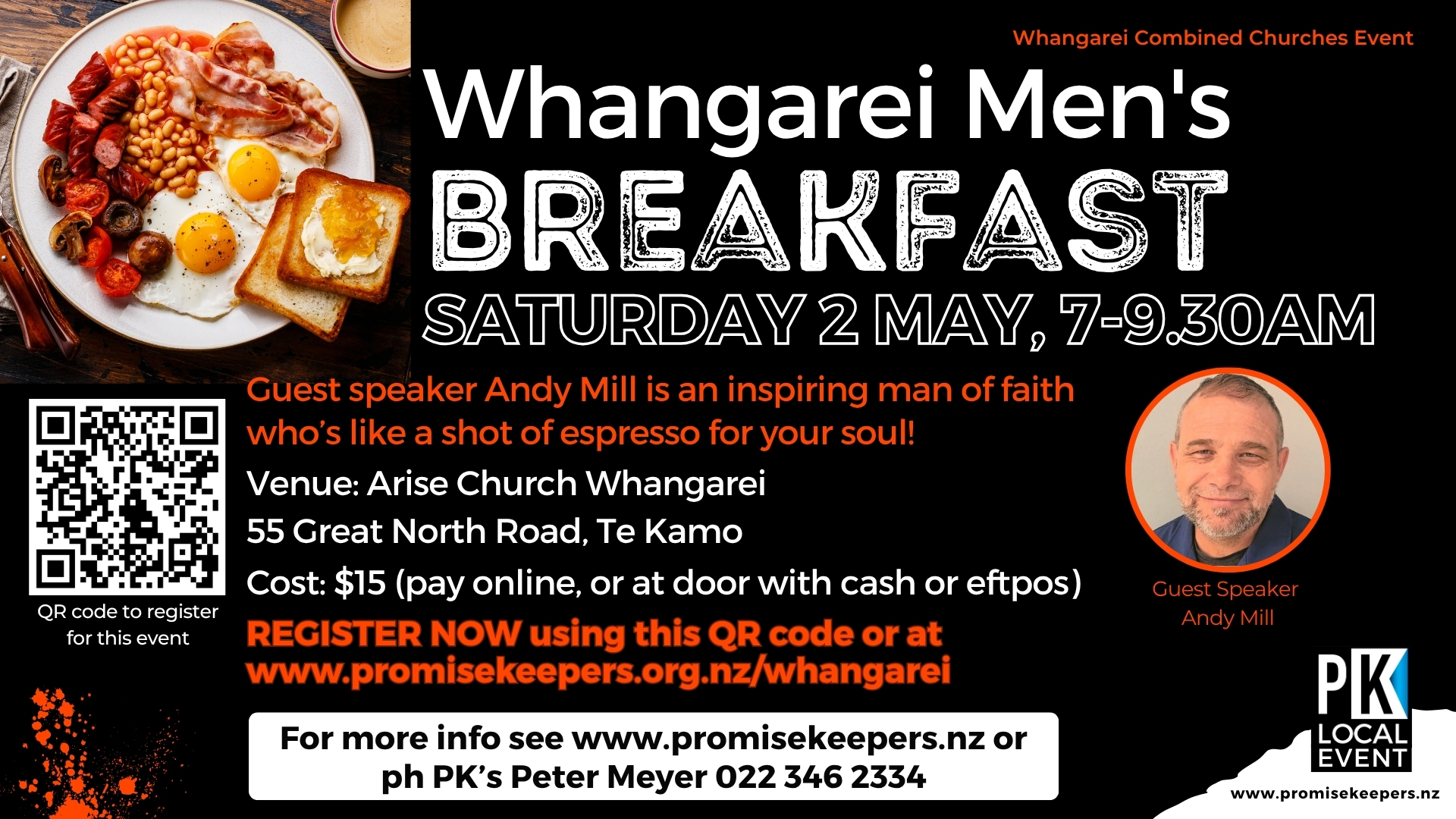 We are so excited about seeing you at the Whangarei Men's Breakfast Event on Saturday 2 May, 7am to 9.30am at Whangarei Arise Church, 55 Great North Road, Te Kamo.Β