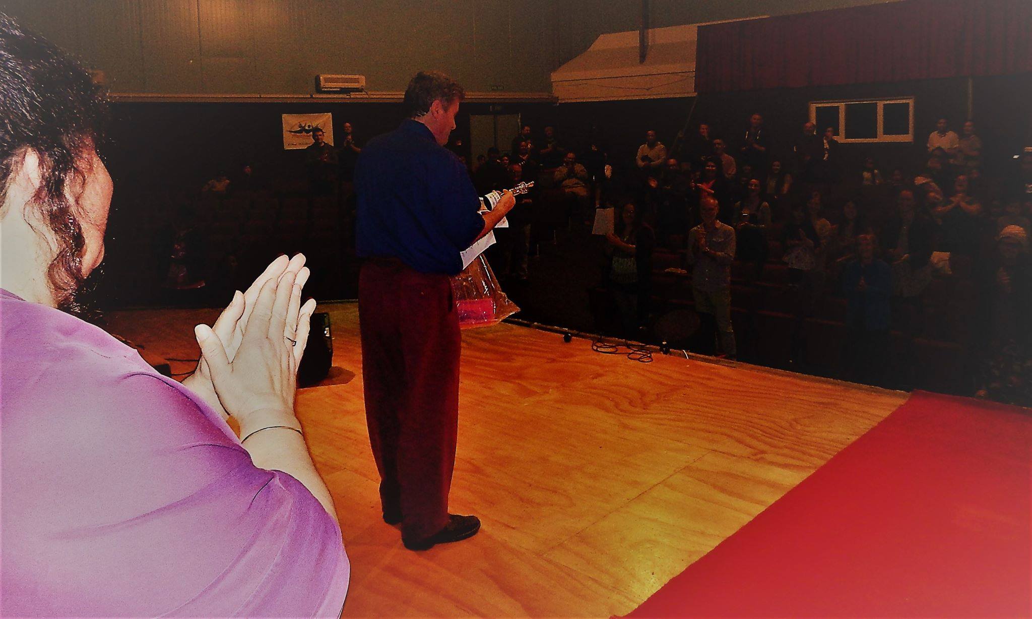 "On Sunday 16th October in our morning service, we had a PowerPoint photo slide show of Gary [Senior Pastor]. It was a fun one that showed the many baptism outfits he has worn, the many styles over the years of both Gary and Pauline, different events we have run as a church, led by Gary i.e. outreaches here and overseas and many other clips, all accompanied by the old song ‘Fight On’. Even though it was [light-hearted] and many enjoyed his looks/styles over the years, it reminded us of his passion, creativity and zeal for God and the calling on his life to serve Him and his heart to reach the lost. This presentation was followed by a standing ovation that turned into a Viking clap - which is arms stretched above the head and clapping - while he came on stage ready to present the morning message. At the evening service he was given a standing ovation as he came on stage with a few encouraging words from our MC."